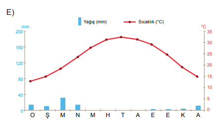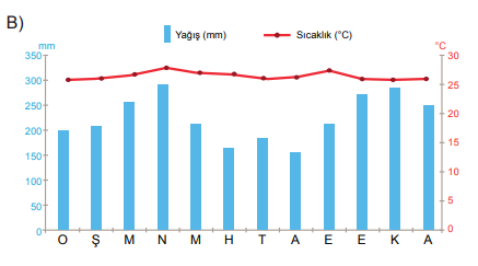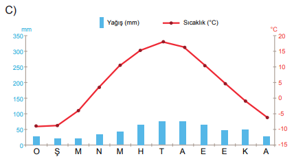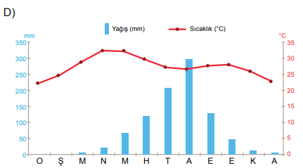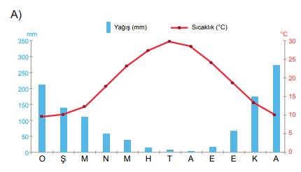 Bu tür yer şekillerinin aşağıda sıcaklık ve yağış grafikleri verilen iklimlerden hangisinde yaygın olarak görülmesi beklenir?