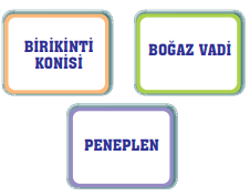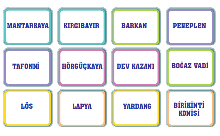 Ecenaz ve Zeynep dış kuvvetlerin oluşturduğu yer şekilleri konusunu pekiştirmek için üzerinde yer şekli isimlerinin yazılı olduğu kartları masa üzerine yerleştirip aşağıdaki oyunu oynamaktadırlar.