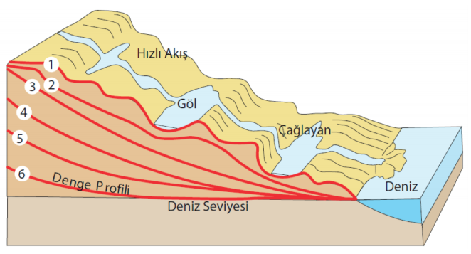 Aşağıdaki görselde bir akarsuyun denge profiline ulaşma aşamaları gösterilmiştir.