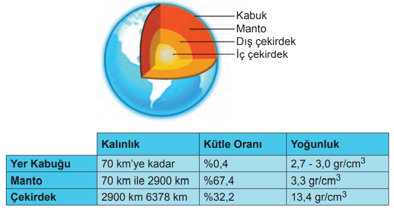Aşağıda yerin yapısını gösteren bir kesit gösterilmiştir.