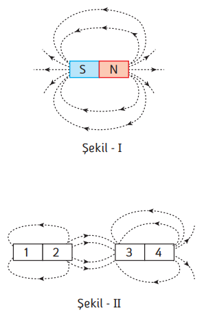 Bir mıknatısın etrafında meydana gelen manyetik alan çizgileri Şekil - I’de görüldüğü gibi N kutbundan S kutbuna doğrudur. Özellikle kutup başlarında daha çoktur.