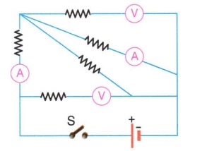 Ampermetre, voltmetre ve özdeş dirençlerle oluşturulan şekildeki elektrik devresinde S anahtarı açıktır.