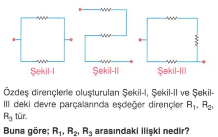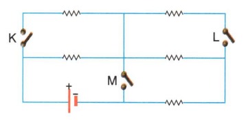 Buna göre, dirençlerin hepsinden akım geçmesi için K, L, M anahtarlarının durumu nasıl olmalıdır?
