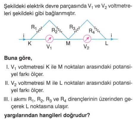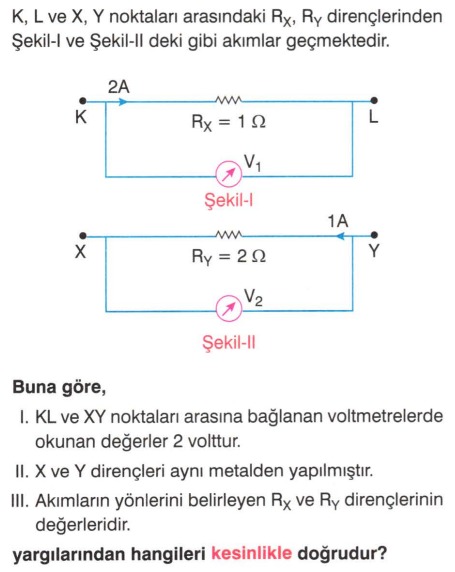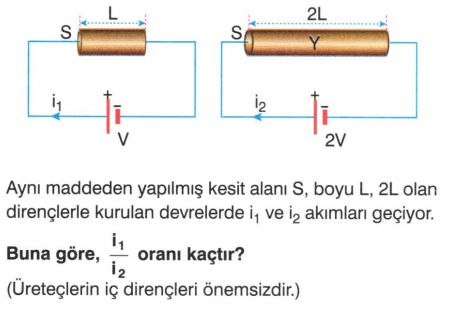 Boyu L kesit alanı S olan bir iletken telin uçlarına V potansiyel farkı uygulandığında telden i akımı geçmektedir. Tel tam ortasından kesilerek boyu L/2 yapılıyor ve uçlarına uygulanan potansiyel farkı 2 katına çıkarılıyor.