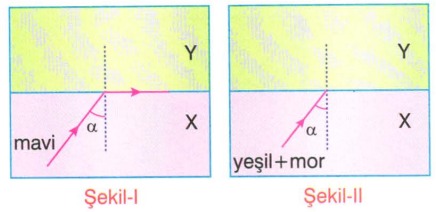Saydam X, Y ortamlarından X ten mavi ışık Şekil-I deki gibi, yeşil+mor ışık Şekil-II deki gibi gönderiliyor.