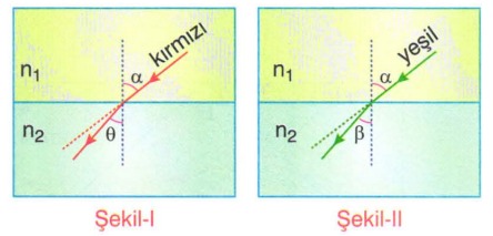 Kırmızı ve yeşil renkli ışınların kırma indisleri n1, n2 olan ortamlarda izledikleri yollar Şekil-I ve Şekil-II de ki gibidir.