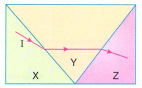 Tek renkli I ışık ışını ışığı kırma indisleri sırasıyla nx, ny, nz olan X, Y, Z saydam ortamlarında şekildeki yolu izliyor.