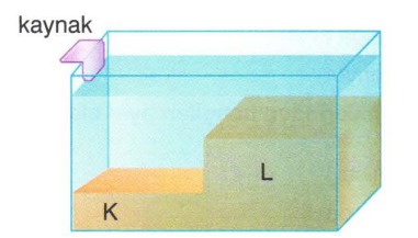 Tabanda şekildeki gibi K ve L engelleri bulunan dalga leğeninde doğrusal periyodik dalgalar oluşturulmaktadır.