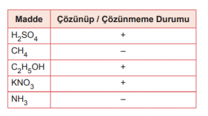 Tabloda bazı maddelerin suda çözünüp / çözünmeme durumları (+ / –) gösterilmiştir.
