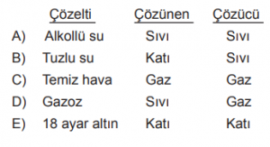 Aşağıda bazı çözeltilerin çözücü ve çözünen türleri gösterilmiştir.