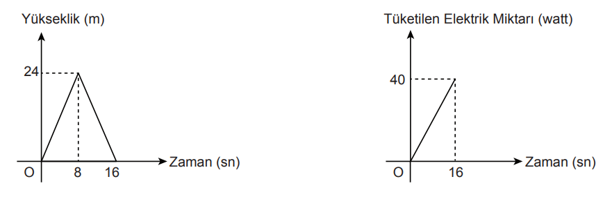 Giriş katında bulunan bir asansör binanın en üst katına çıkıp iniyor. Bu asansörün bulunduğu yüksekliğin ve tükettiği elektriğin zamana göre değişimi aşağıdaki doğrusal grafiklerle gösterilmiştir.