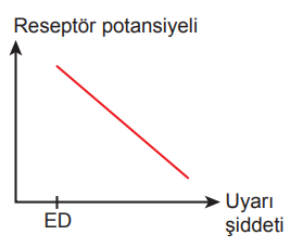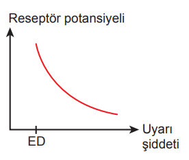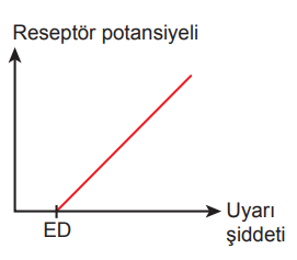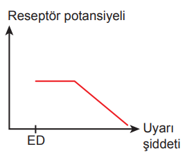 Buna göre uyaran şiddeti ile reseptör potansiyeli arasındaki ilişkiyi gösteren grafik aşağıdakilerden hangisi olabilir?