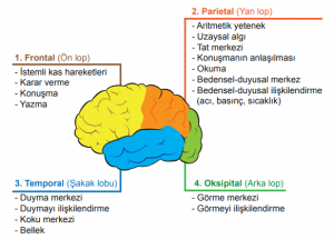 Uç beyin, sağ ve sol olmak üzere iki yarım küreden oluşur. Her yarım küre, şekilde gösterildiği gibi dört lobtan oluşur.