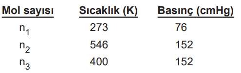 Aşağıda bir gazın eşit hacimli kaplarda farklı sıcaklık ve basınçlardaki mol sayıları verilmiştir.