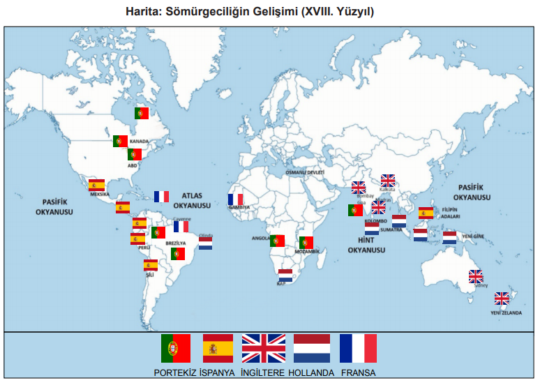 Sömürgeciliğin gelişimi ile ilgili verilen harita incelendiğinde aşağıdaki yargılardan hangisine ulaşılamaz?