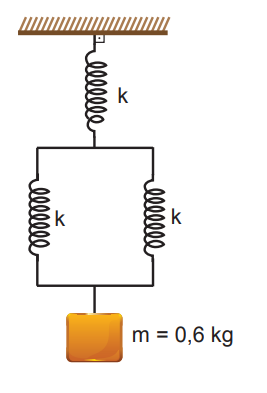 Yay sabiti 40 N/m olan özdeş yaylarla kurulan yay sarkacının ucuna 0,6 kg kütleli cisim bağlanarak dengeye getirilmiştir.