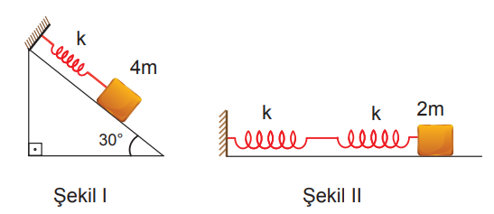Özdeş yaylarla oluşturulan sürtünmez sistemlerden Şekil I'deki sarkacın periyodu T1, Şekil II'deki sarkacın