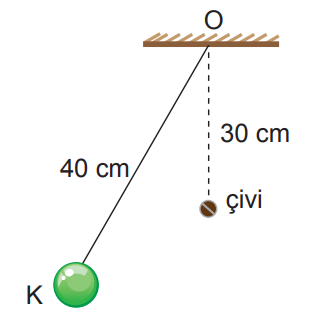 40 cm uzunluğunda olan şekildeki sarkaç O noktasının düşeyinden 30 cm aşağıdaki çiviye takılacak şekilde düzenlenmiştir.