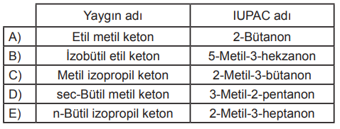 Buna göre aşağıdaki tabloda yaygın adları verilen ketonlardan hangisinin IUPAC adı yanlıştır?