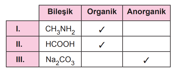 Tabloda verilen bileşikler organik / anorganik olarak “√” işareti ile işaretlenmiştir.