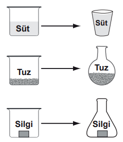 Beherlerde bulunan süt, tuz ve silgiyi şekildeki gibi farklı kaplara koyan Zeynep’in aşağıdaki söylediklerinden hangisi doğrudur?