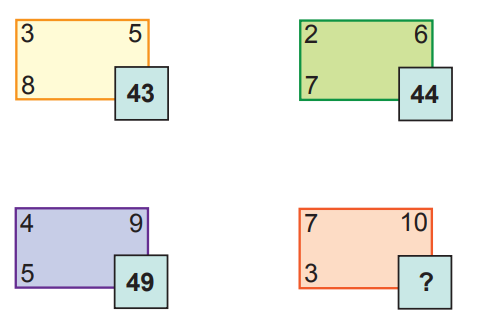 Yukarıdaki şekillerde, dikdörtgenin köşelerindeki üç sayıdan ikisinin çarpımı üçüncüye eklenmiştir. Elde edilen sayı karenin içine yazılmıştır.