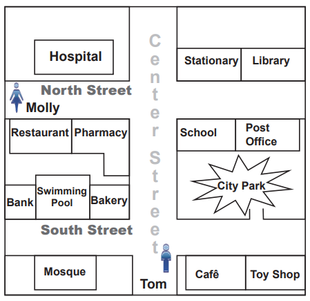 Tom goes straight ahead on Central Street. He crosses South Street. Then, he turns right in the second road. He is - - - - .