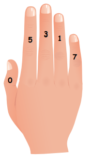 Bir matematik öğretmeni sağ elindeki parmaklarına aşağıdaki gibi 0, 5, 3, 1 ve 7 rakamlarını yazar.