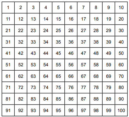 Kare şeklindeki bir karton 100 tane eş kareye ayrılıp bu karelere aşağıdaki gibi 1’den 100’e kadar olan doğal sayılar sırasıyla yazılıyor.