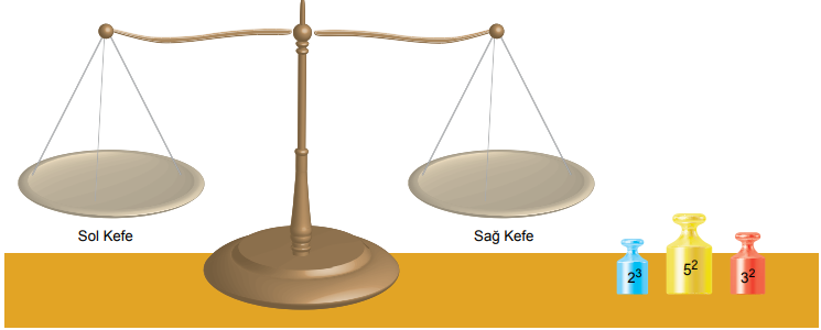 Bir paketin kütlesini bulmak isteyen Zeynep aşağıda verilen eşit kollu teraziyi ve ağırlıkları kullanmıştır. Kullanılan her ağırlığın kilogram cinsinden kütlesi üslü ifade şeklinde ağırlıkların üzerine yazılmıştır.