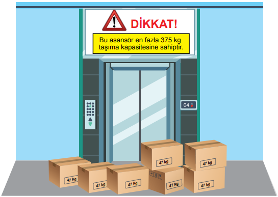 Buna göre kütlesi 74 kg olan görevli, asansöre kütleleri 47 kg olan kolilerden en çok kaç tanesi ile bindiğinde asansör hareket eder?