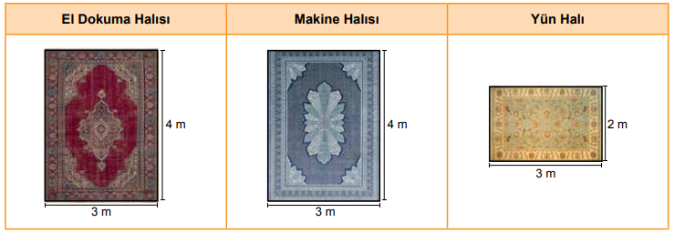 Ayşe Hanım’ın yıkatmak istediği dikdörtgen şeklindeki halıların türleri ve kenar uzunlukları aşağıda verilmiştir.