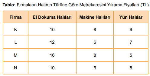 Ayşe Hanım halılarını yıkatmak için dört farklı firmadan fiyat teklifi almıştır. Bu firmaların halının türüne göre metrekaresini yıkama fiyatları aşağıdaki tabloda verilmiştir.