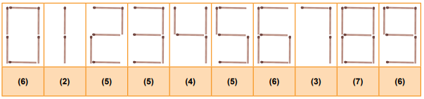 Aşağıda kibrit çöpleri kullanılarak oluşturulan rakamlar ve altlarında bu rakamı oluşturmak için kaç tane kibrit çöpü kullanıldığı gösterilmiştir.
