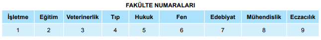 Aşağıda bu üniversitedeki fakülte numaraları verilmiştir.