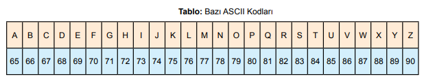 Aşağıda bazı ASCII kodlarının yazılı olduğu bir tablo verilmiştir