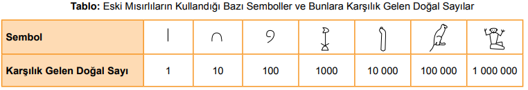 Aşağıdaki tabloda eski Mısırlıların kullandıkları bazı semboller ve bunlara karşılık gelen doğal sayı verilmiştir.