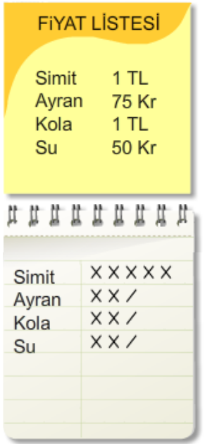 Safranbolu’nun susamsız simidinin meşhur olduğunu duyan Tuğçe, arkadaşlarıyla simit yemek için Safranbolu’ya gitmiştir. Tuğçe ve arkadaşlarının gittikleri pastanedeki fiyat listesi ile garsonun siparişleri yazdığı not defteri aşağıda verilmiştir.
