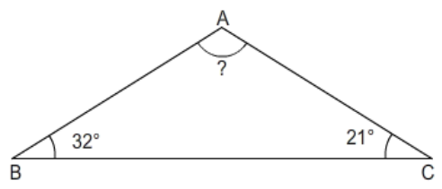 Yukarıdaki ABC üçgeninde, ABC açısının ölçüsü 32° ve ACB açısının ölçüsü 21° olduğuna göre, BAC açısının ölçüsü kaç derecedir?