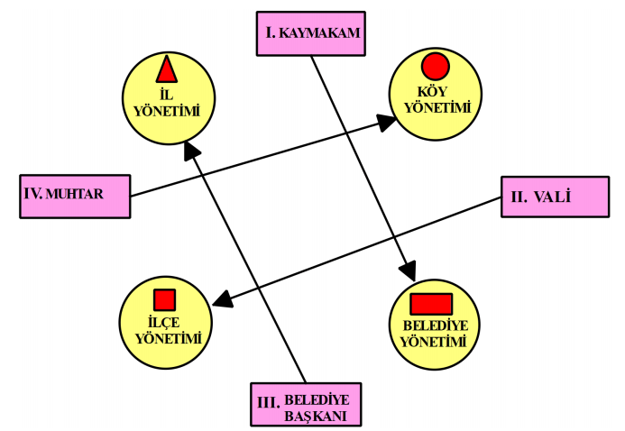 Aşağıda verilen şemada yönetim yerleri ve yöneticileri numara ve şekiller ile eşleştirilmiştir.
