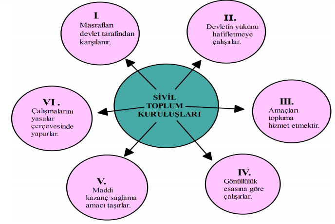 Aşağıda sivil toplum kuruluşlarının özellikleri şema şeklinde verilmiştir. Fakat şema hazırlanırken hata yapılmıştır.