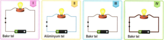 Bu elektrik devrelerindeki iletken tel uzunlukları I >II= III = IV iken iletken tel dik kesit alanları IV> I =II= III