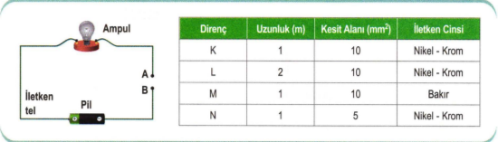 Ampul, pil ve iletken tel ile hazırlanan elektrik devresinin A- B uçları boş bırakılmıştır ve sırasıyla tabloda verilen dirençler denenecektir.