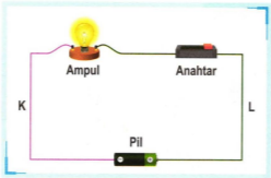 Ampul, pil, K ve L telleri ile yapılan bir devrede ampul aşağıdaki gibi ışık vermektedir.