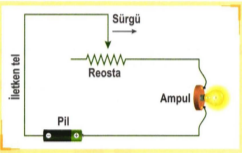Ampul, pil, iletken tel ve reosta (değişken direnç) ile aşağıdaki gibi bir elektrik devresi hazırlanmıştır.
