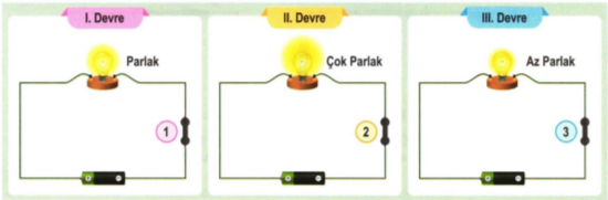 Bilgi: Devredeki direnç değeri artarsa elektrik devresinden geçen elektrik akımı azalır ve buna bağlı olarak devredeki ampul parlaklığı da azalır.