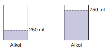 İçlerinde aynı koşullarda saf etil alkol bulunan iki kaptaki sıvıların hacimleri dereceli silindirlerle