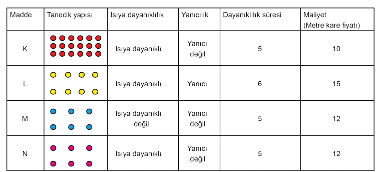 Tablodaki tüm özellikler birlikte değerlendirildiğinde Nazım Usta malzemelerden hangisini ısı yalıtım malzemesi olarak seçerse en uygun seçimi yapmış olur?