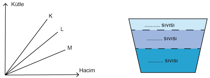 İlkay, grafikte kütle ve hacmi verilen birbiri içine karışmayan K, L, M sıvılarını şekildeki kaba koyarak denge durumlarını gözlemliyor.