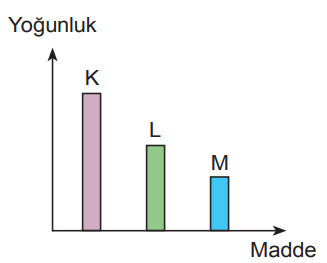 Hasan birbiri içinde çözünmeyen K, L ve M sıvılarını ayırma hunisine koyuyor ve kabın son durumu ile aşağıdaki yorumları yapıyor.